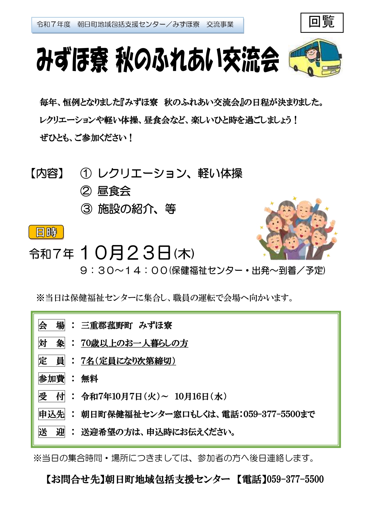 トップページ 暮らしの情報 行政情報 広報・広聴 回覧 令和7年 9月みずほ寮 秋のふれあい交流会 10月23日