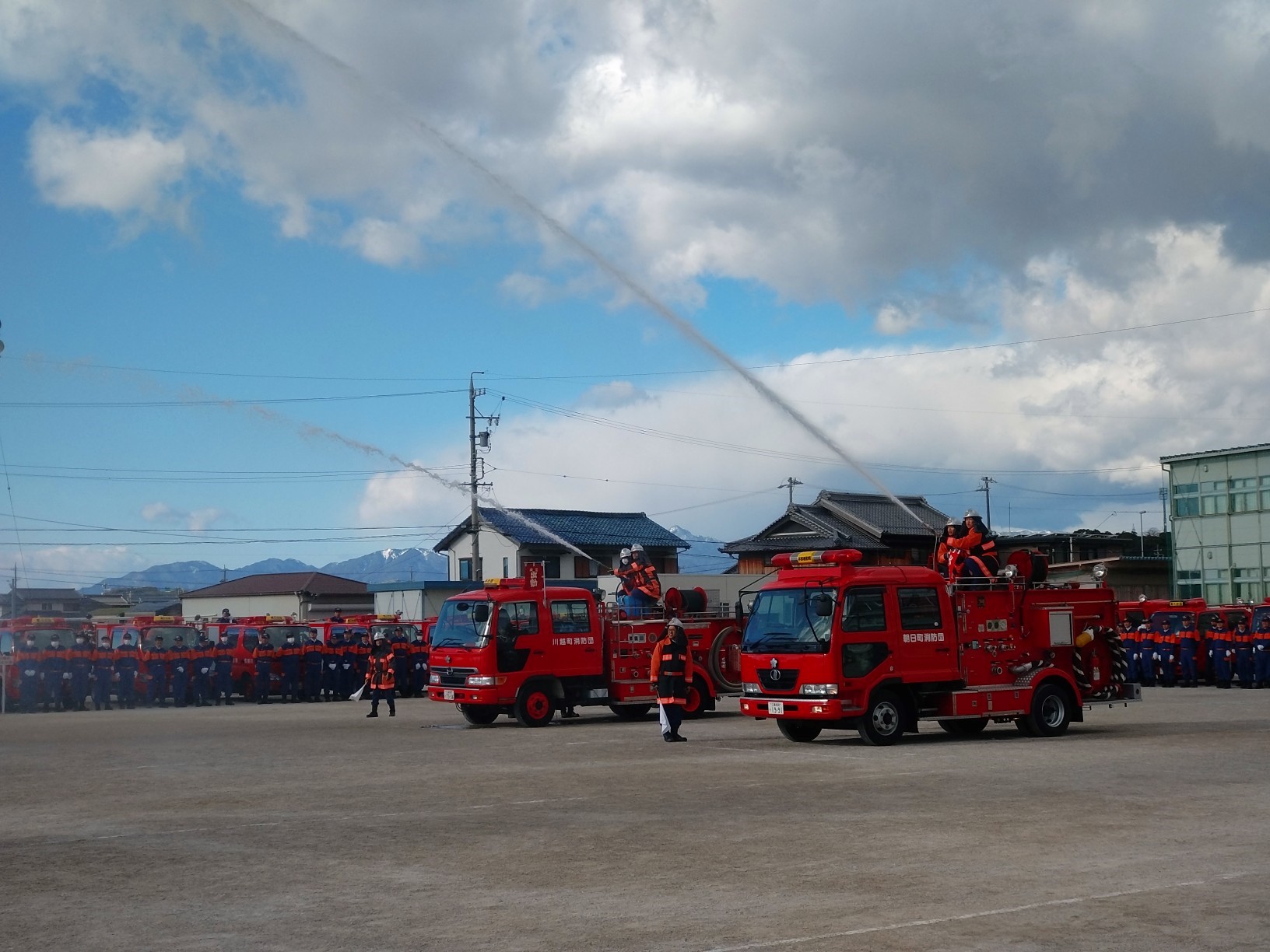式典当日は天候に恵まれ、入場行進に始まり、町長告辞、姿勢・服装・機械器具の点検、各種表彰、両町ポンプ車による放水披露を最後に出初式を終了しました。