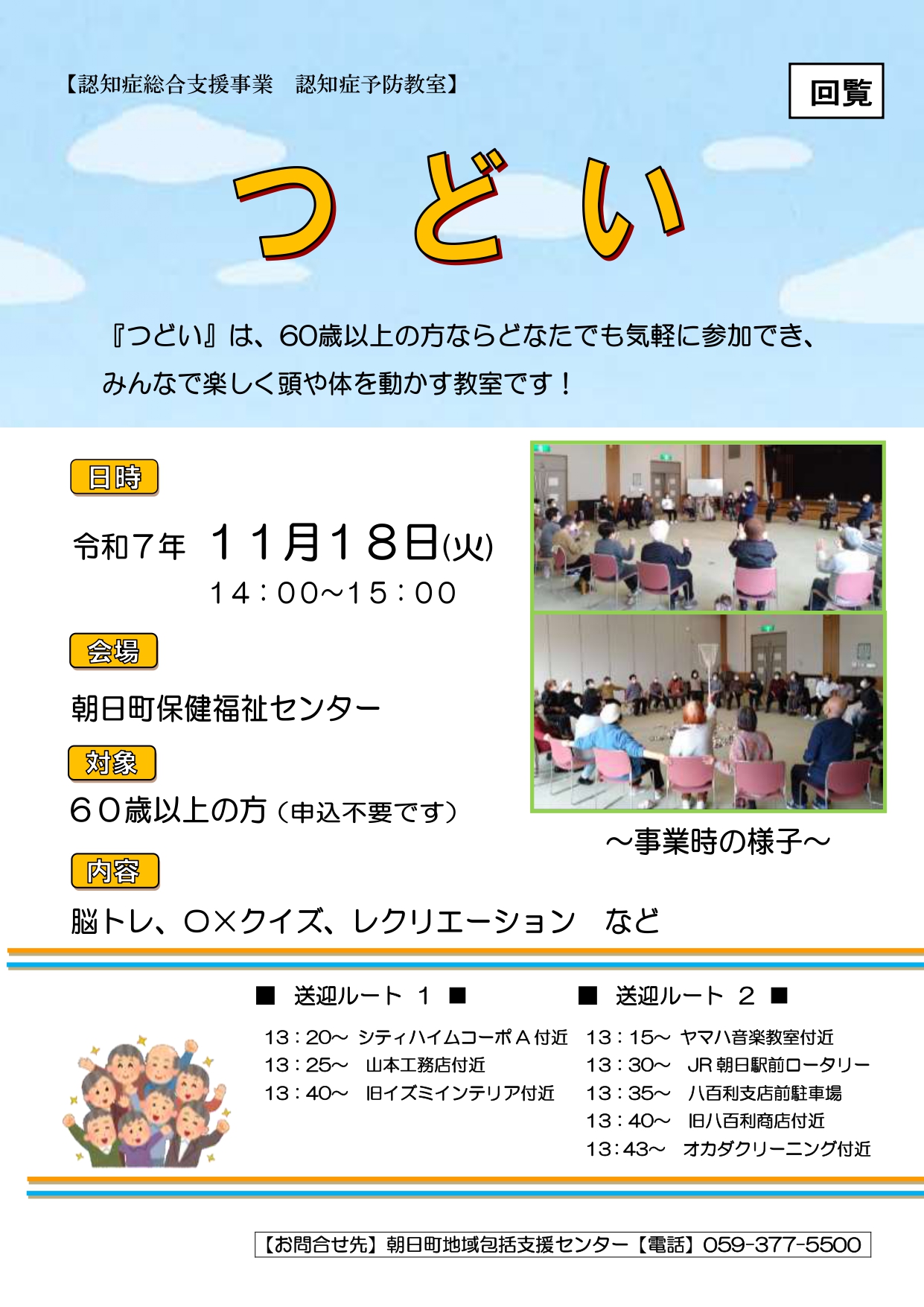トップページ 暮らしの情報 行政情報 広報・広聴 回覧 令和7年 10月 【認知症総合支援事業 認知症予防教室】つどい 令和7年11月18日