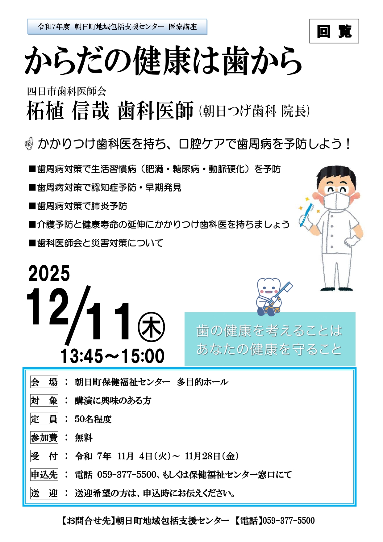 トップページ 暮らしの情報 行政情報 広報・広聴 回覧 令和7年 10月 【令和7年度朝日町地域包括支援センター・医療講座】からだの健康は歯から 12月11日