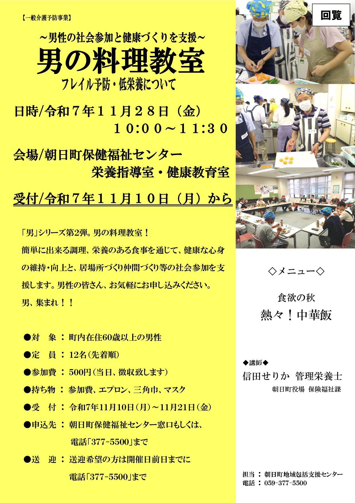トップページ 暮らしの情報 行政情報 広報・広聴 回覧 令和7年 10月 【一般介護予防事業】男の料理教室 11月28日