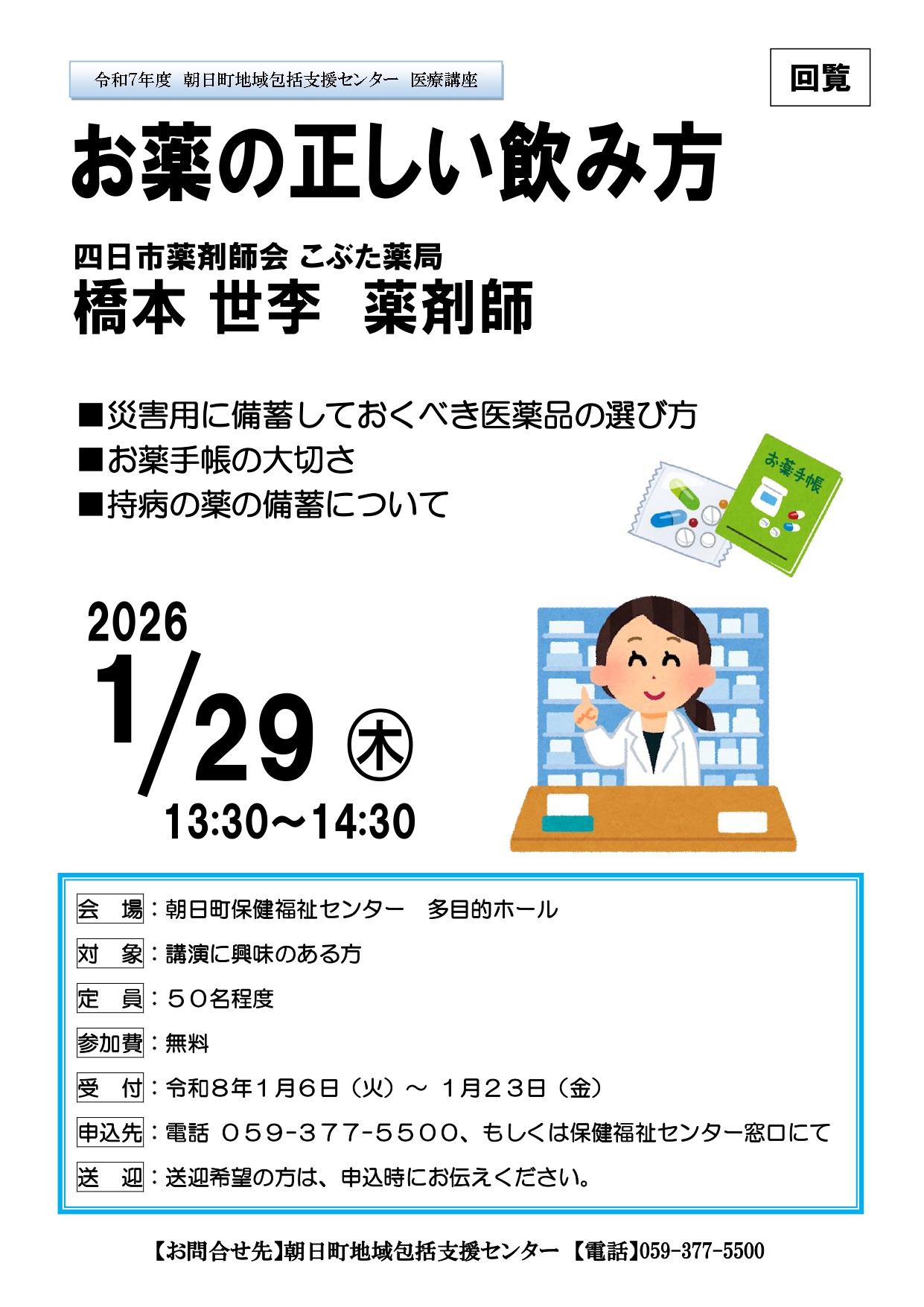 トップページ 暮らしの情報 行政情報 広報・広聴 回覧 令和7年 12月 【令和7年度朝日町地域包括支援センター・医療講座】お薬の正しい飲み方 1月29日