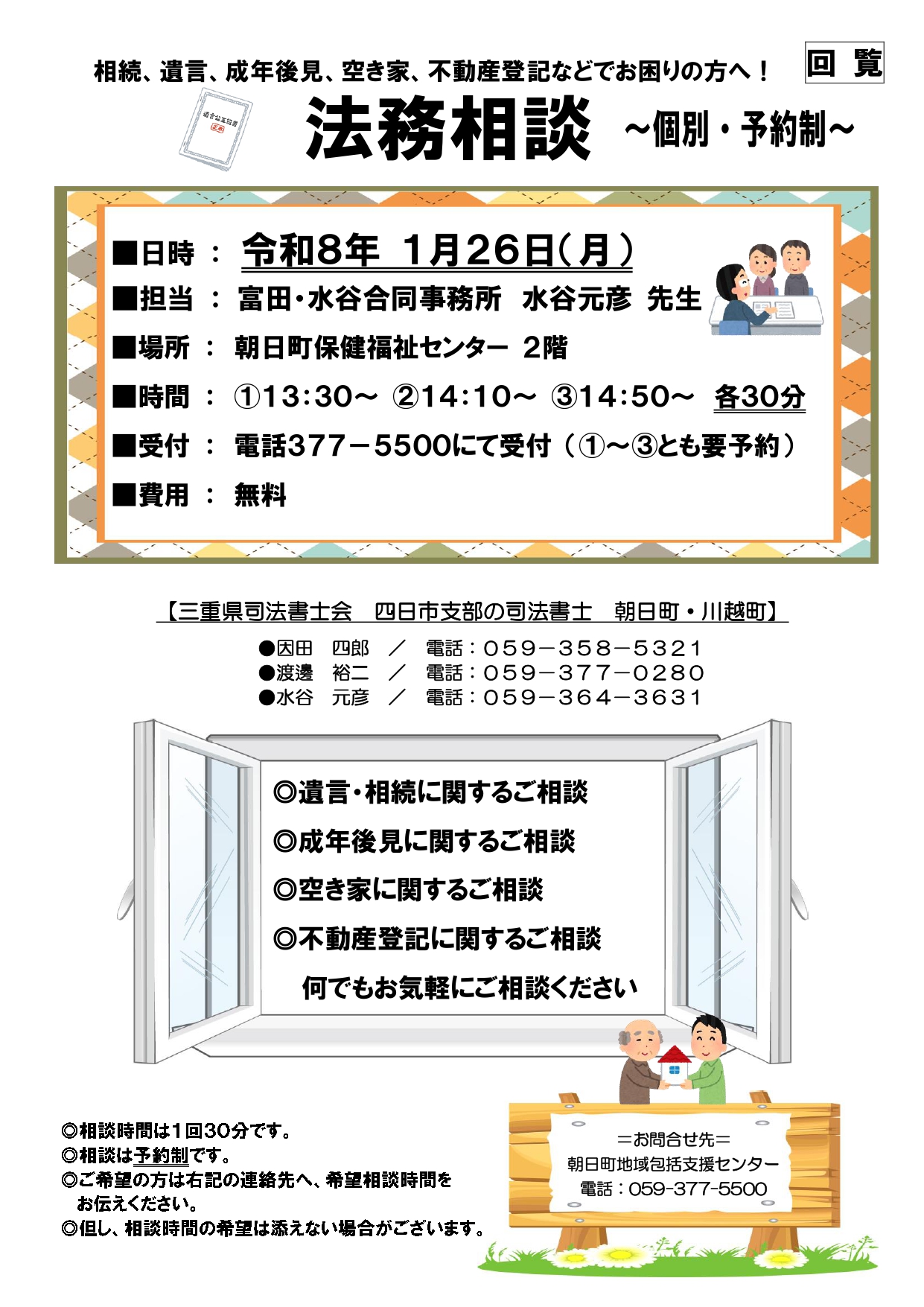 トップページ 暮らしの情報 行政情報 広報・広聴 回覧 令和7年 12月相続、遺言、成年後見、空き家、不動産登記などでお困りの方へ! 法務相談 ~個別・予約制~