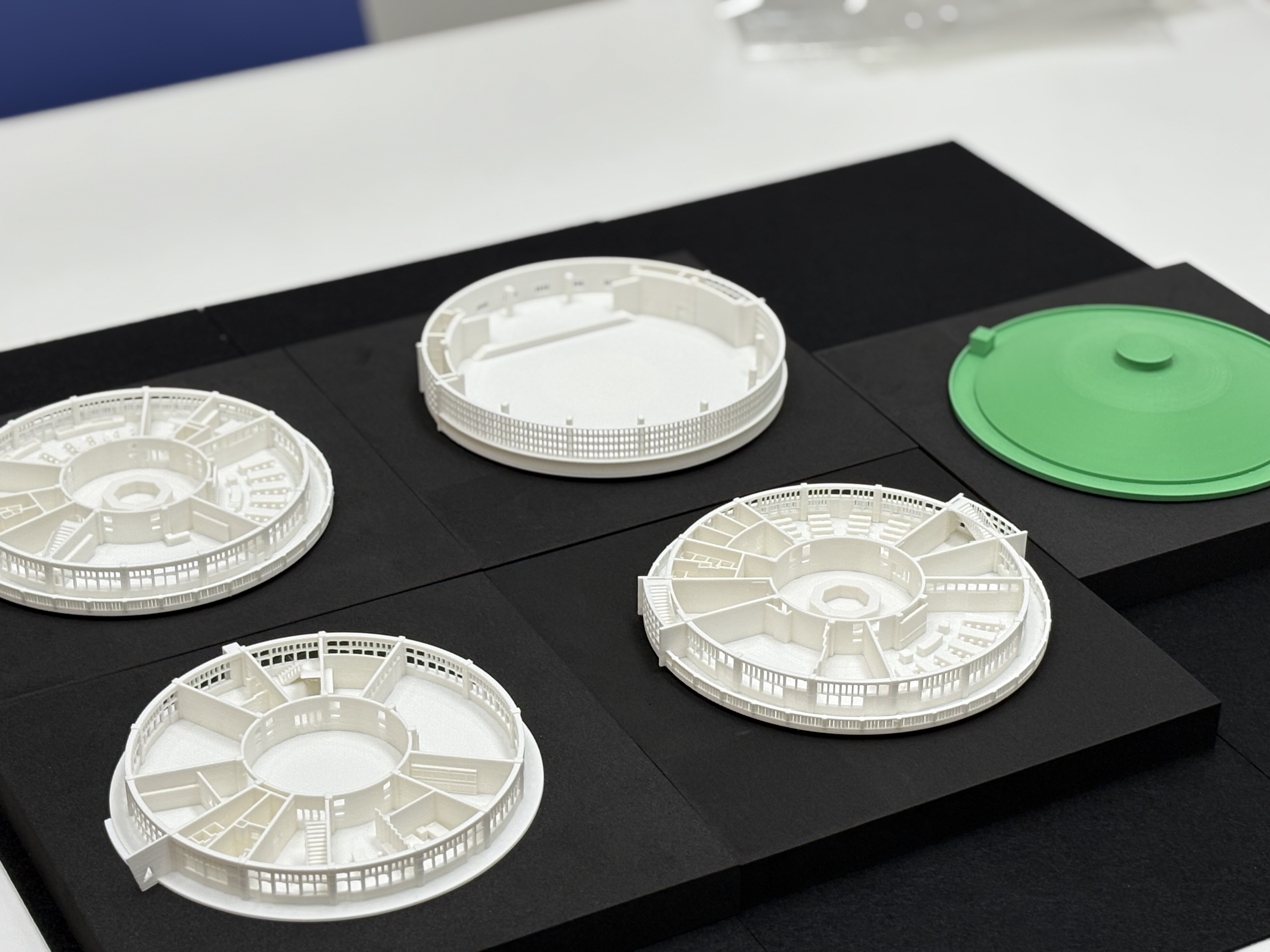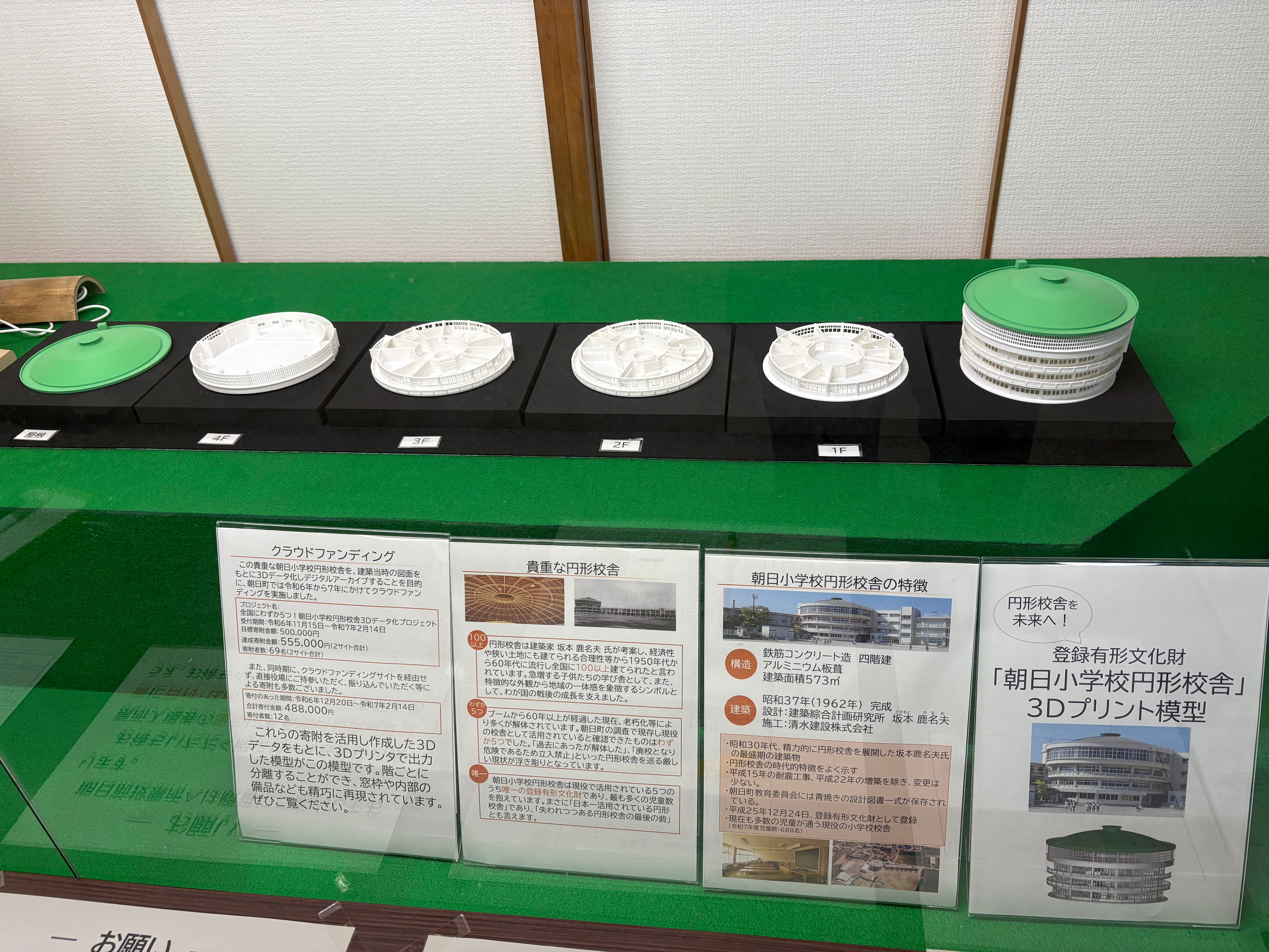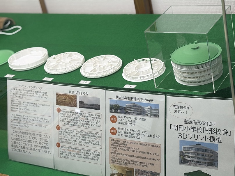 令和6年から7年にかけて実施したクラウドファンディング「全国にわずか5つ!朝日小学校円形校舎3Dデータ化プロジェクト」により集まった寄付金を活用した3Dプリント模型(5基)が完成しました!
