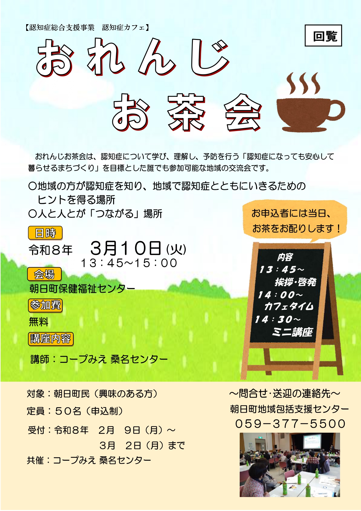 トップページ 暮らしの情報 行政情報 広報・広聴 回覧 令和8年 1月 【認知症総合支援事業 認知症カフェ】おれんじ お茶会 3月10日